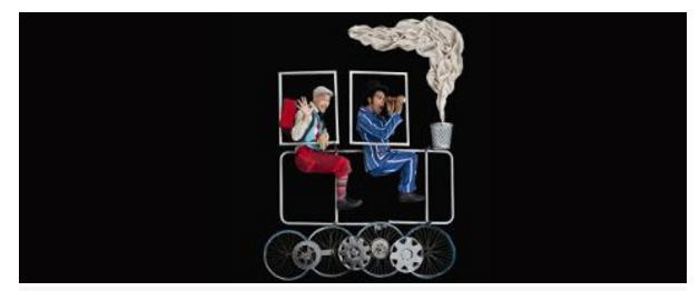 Descrição da foto: Fotografia colorida com fundo preto dos personagens Mr. Fog e Passepartur sentados um atrás do outro, dentro do contorno de um trem feito de canos de ferro. Mr. Fog, um homem negro, sentado à frente, olha boquiaberto por uma luneta. Usa terno azul com listras brancas e uma cartola na cabeça. Passepartur um homem de pele clara, logo atrás, acena sorridente. Ele usa boina cinza, camisa branca, colete azul, calça curta vermelha e meias coloridas. Quatro rodas de bicicleta e três calotas de carro formam as rodas do trem, um balde forma a chaminé na frente, e um grande tecido branco a fumaça.