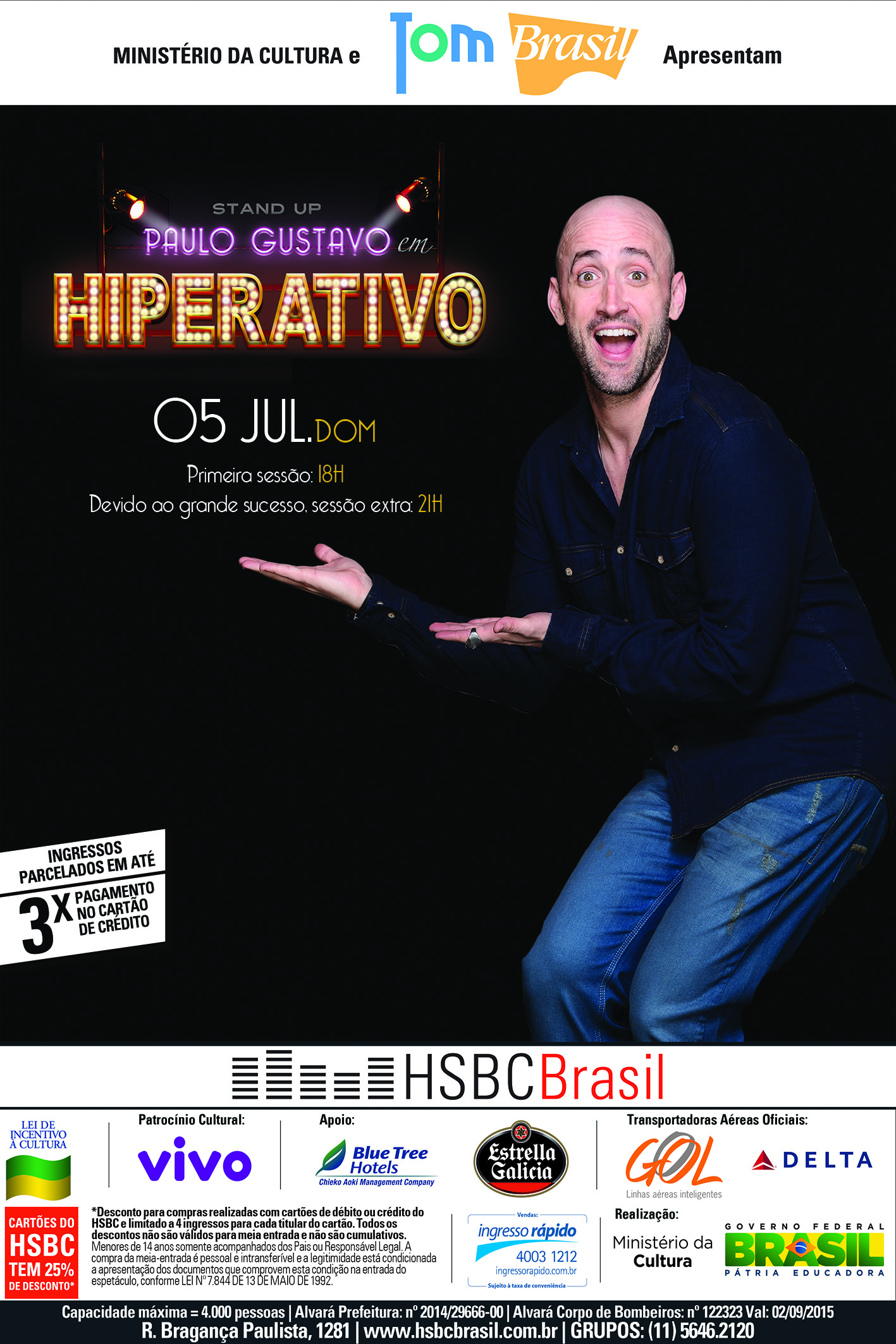 Sobre o stand up: HIPERATIVO é mais um trabalho de Paulo Gustavo, que após o enorme sucesso de Minha Mãe é Uma Peça, sobe ao palco sem maquiagem ou personagem. Com seu humor peculiar, talento diferenciado, visão criativa e recursos especiais, mostra alguns dos dramas que vivemos nos dias de hoje, como fazer escolhas, expressar-se, administrar os medos todos (de avião, de ficar sozinho, de perder a saúde), a convivência com as pessoas, a irritação que ela pode provocar, as inevitáveis comparações, a vida afetiva na pós-modernidade com suas noitadas, buscas, caças, competições, erros, inseguranças…Você já parou prá pensar como tudo isso pode ser engraçadíssimo quando visto de fora?